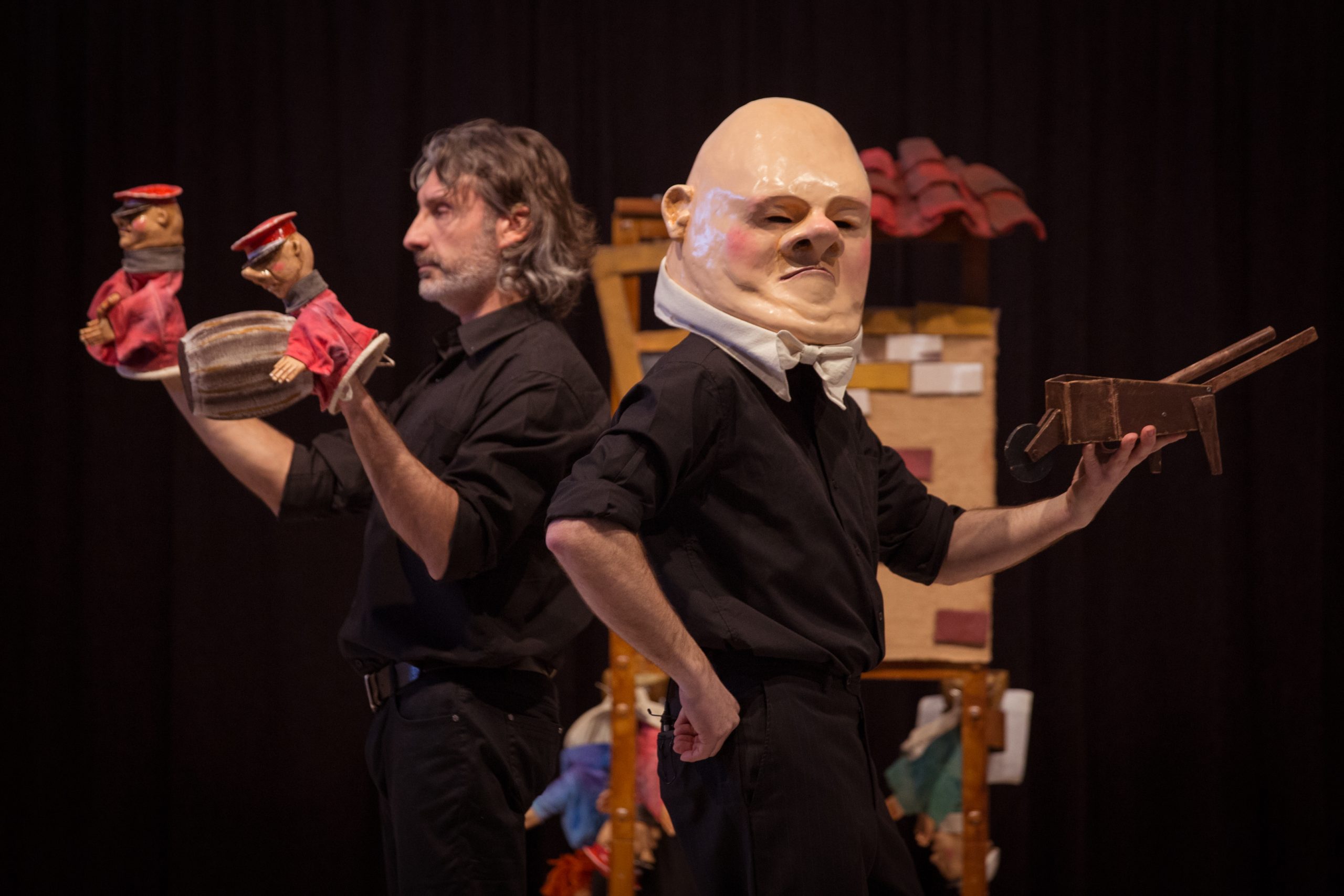 - Interacció directa amb el públic: L’absència de barreres entre els actors, els titelles i el públic crea una experiència immersiva, on l’audiència se sent part activa de la narrativa.