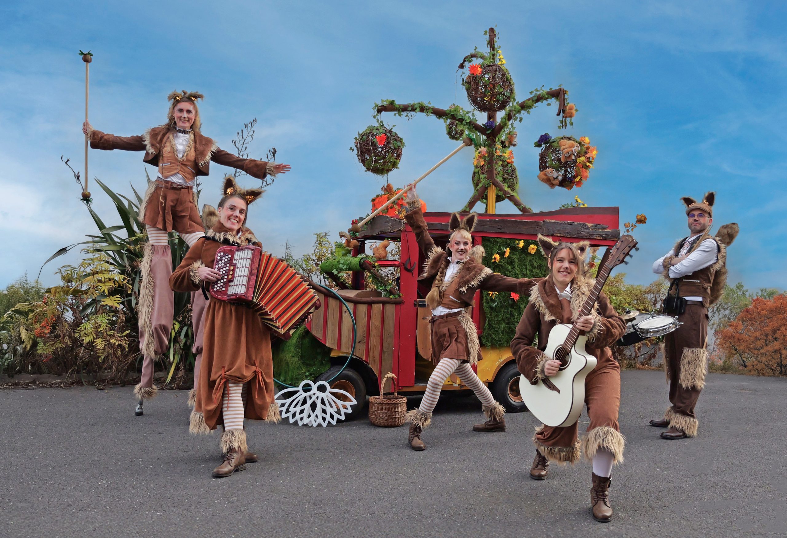 🎶 Al ritmo del acordeón, la guitarra y las percusiones, estos simpáticos ardillas-artistas, expertos en música, teatro y circo, desfilan entre las ramas con agilidad y pasión. Con sus trajes marrones, colas esponjosas y orejas luminosas, ¡son un espectáculo en sí mismos!